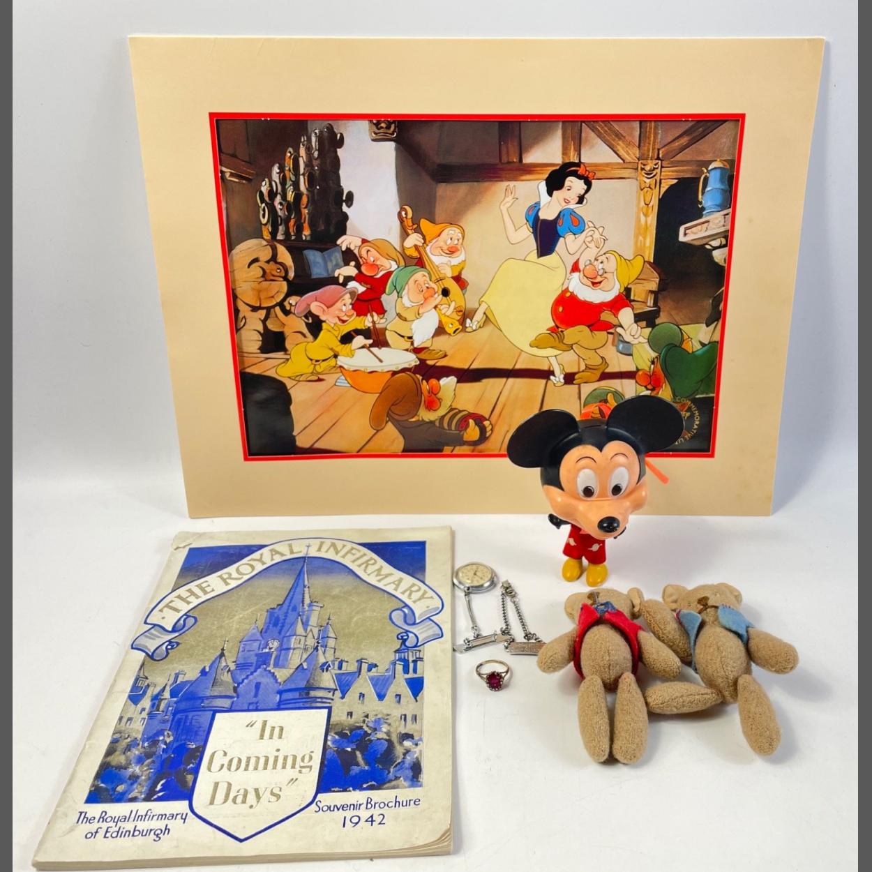 A mixed lot to include a ring with indistinct marks, Size L, a commemorative Walt Disney's Snow White and the Seven Dwarves LITHOGRAPH from 1994 (32x22cm), a nurse's watch by Sekonda, a white metal QEII silver jubilee bracelet, two tiny vintage teddies made from tweed approx 12cm long, a vintage Mickey Mouse approx 13cm tall and a souvenir brochure of the ROYAL INFIRMARY of EDINBURGH "In Coming Days" from 1942