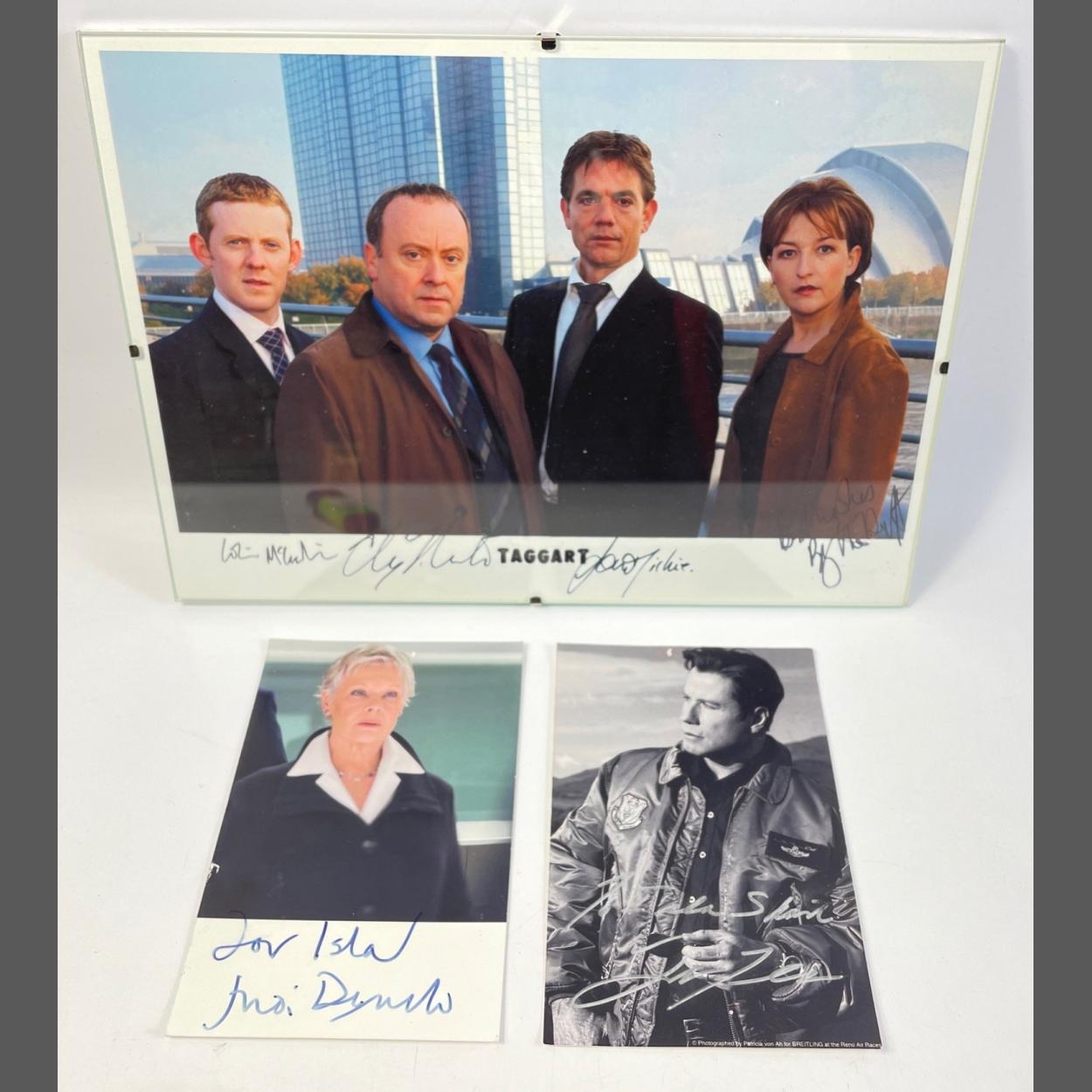 Three signed photos to include JUDI DENCH and JOHN TRAVOLTA both postcard size and a framed A4 photo of the stars of TAGGART, A4 size