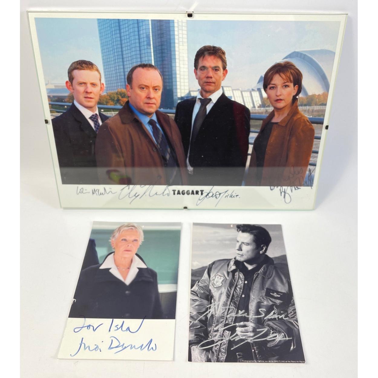 Three signed photos to include JUDI DENCH and JOHN TRAVOLTA both postcard size and a framed A4 photo of the stars of TAGGART, A4 size