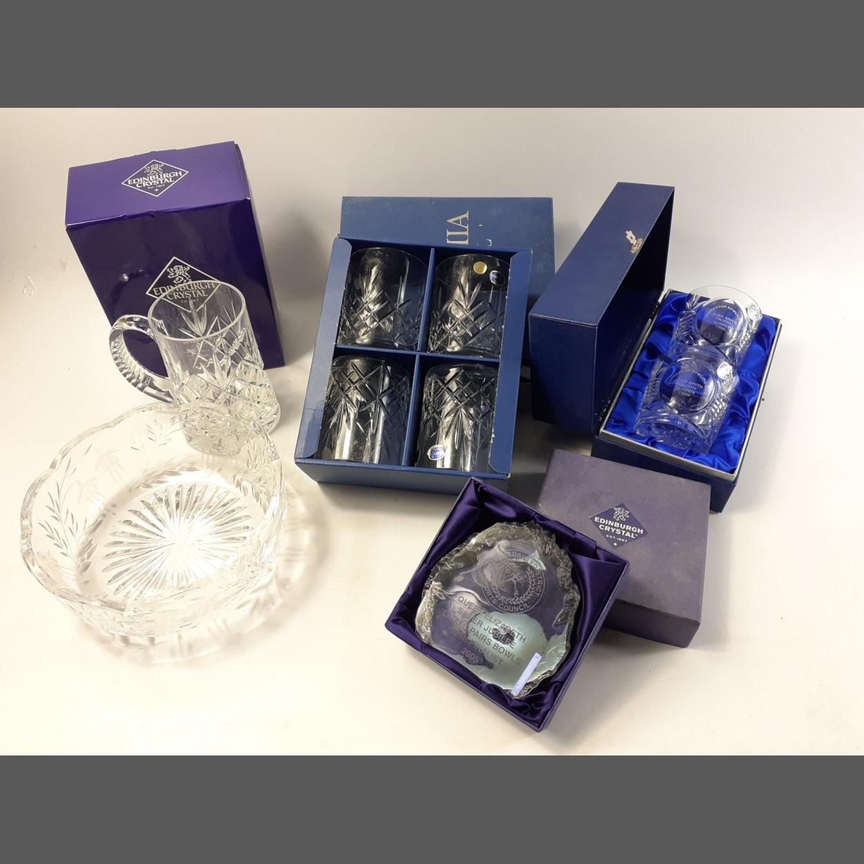 A small collection of crystal items to include a boxed Edinburgh Crystal mug / tankard, a rather hefty etched 20cm bowl, a box of four useful Bohemia Crystal whisky tumblers, a box containing two Glencairn THANKERTON Bowling Club presentation glasses and a boxed Edinburgh Crystal bowls plaque.