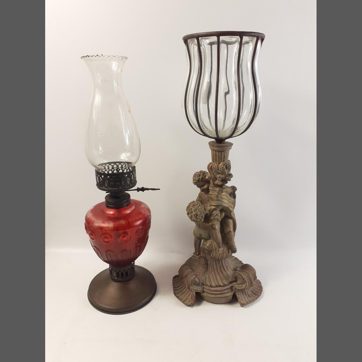 A couple of nice lights - one VINTAGE oil lamp with a nice red glass reservoir and glass chimney - dimension incl chimney 42cm height approx