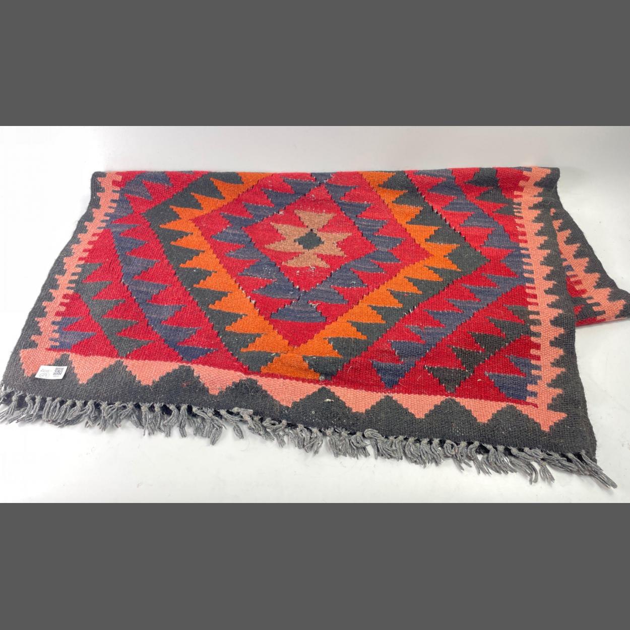 A woollen woven rug in autumnal red shades, size 80x180cm approx