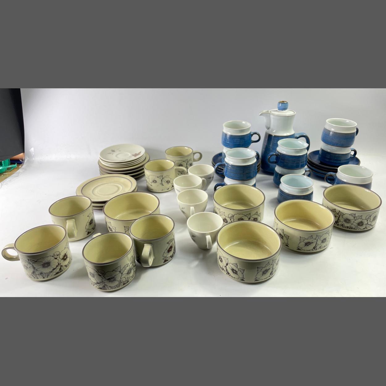 A part ROYAL DOULTON Tumbling Leaves coffee set consisting of 4 cups and saucers, a tea service in Denby-style shades of blue - 8 cups, 8 saucers, 1 coffee pot, 1 milk jug and 1 sugar bowl, and a part HORNSEA dinner service to include 6 cups, 7 saucers and 5 bowls in a used condition