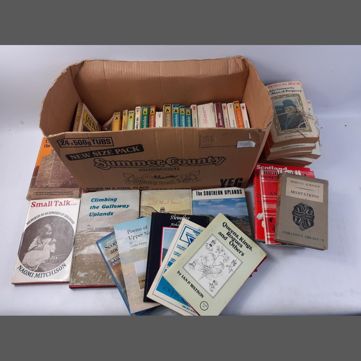 A collection of books both hardback and paperback to include The Forsyth Chronicles with Scottish interest books to include Scottish Walks and Legends and also Stewarty of Kircudbright, Highland Balls and Village Halls and so much more