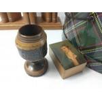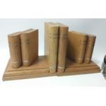 A nice little collection of MAUCHLINE ANTIQUE WOODENWARE pieces to include a lovely tartan tray 24cm approx, a Robert Burns small box with a great image and a small letter rack. Lot also includes a pair of wooden book ends and a small treen pot. All in a modern tartan hat box with lid.