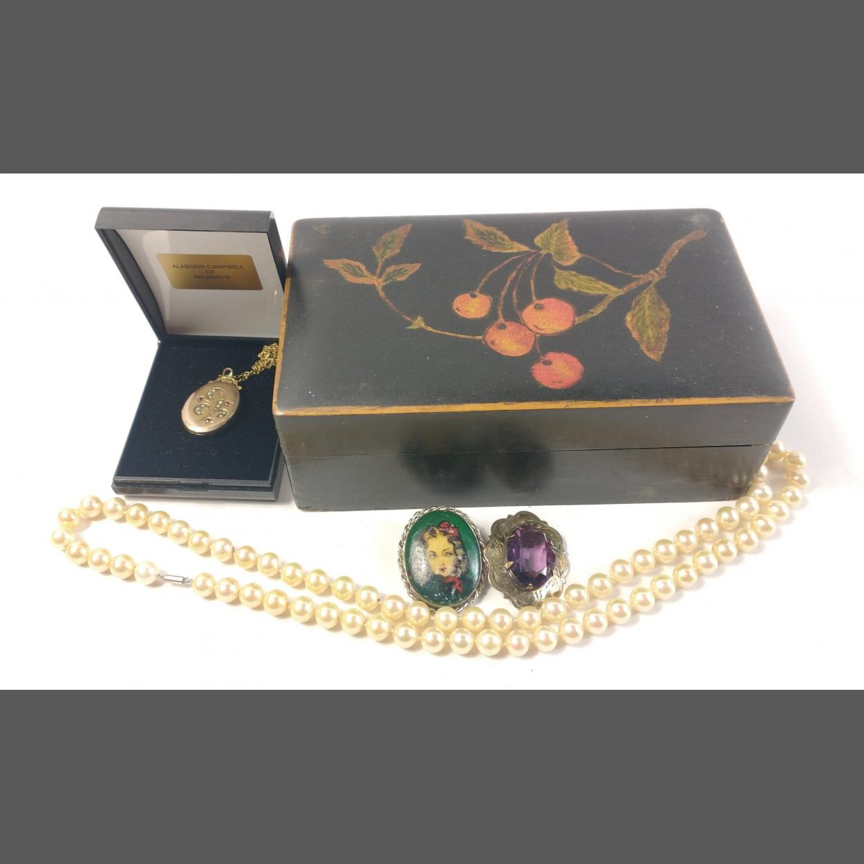 A black lacquer fruit wood small jewellery box with contents to include a gilt pendant with rolled gold chain, a string of artificial pearls, a 1936 dated painted pendant and a gold plated etched brooch with a large purple stone. A very attractive little collection.