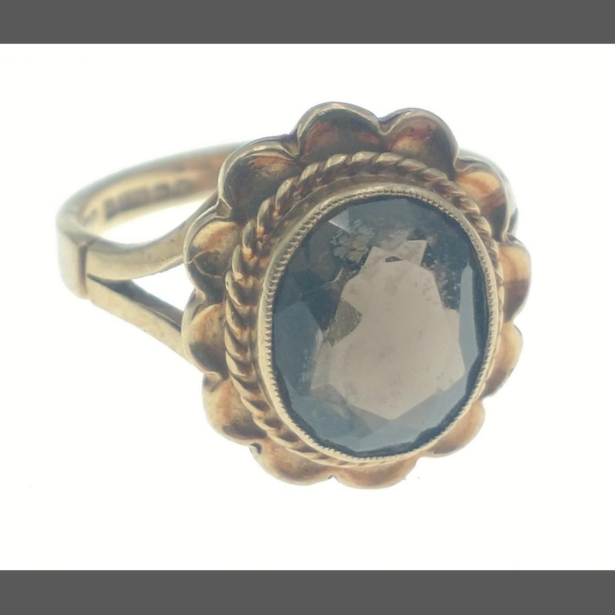 A 375 stamped yellow gold ring with an oval brown smokey quartz centred stone, ring size K and gross weight 3.67g approx