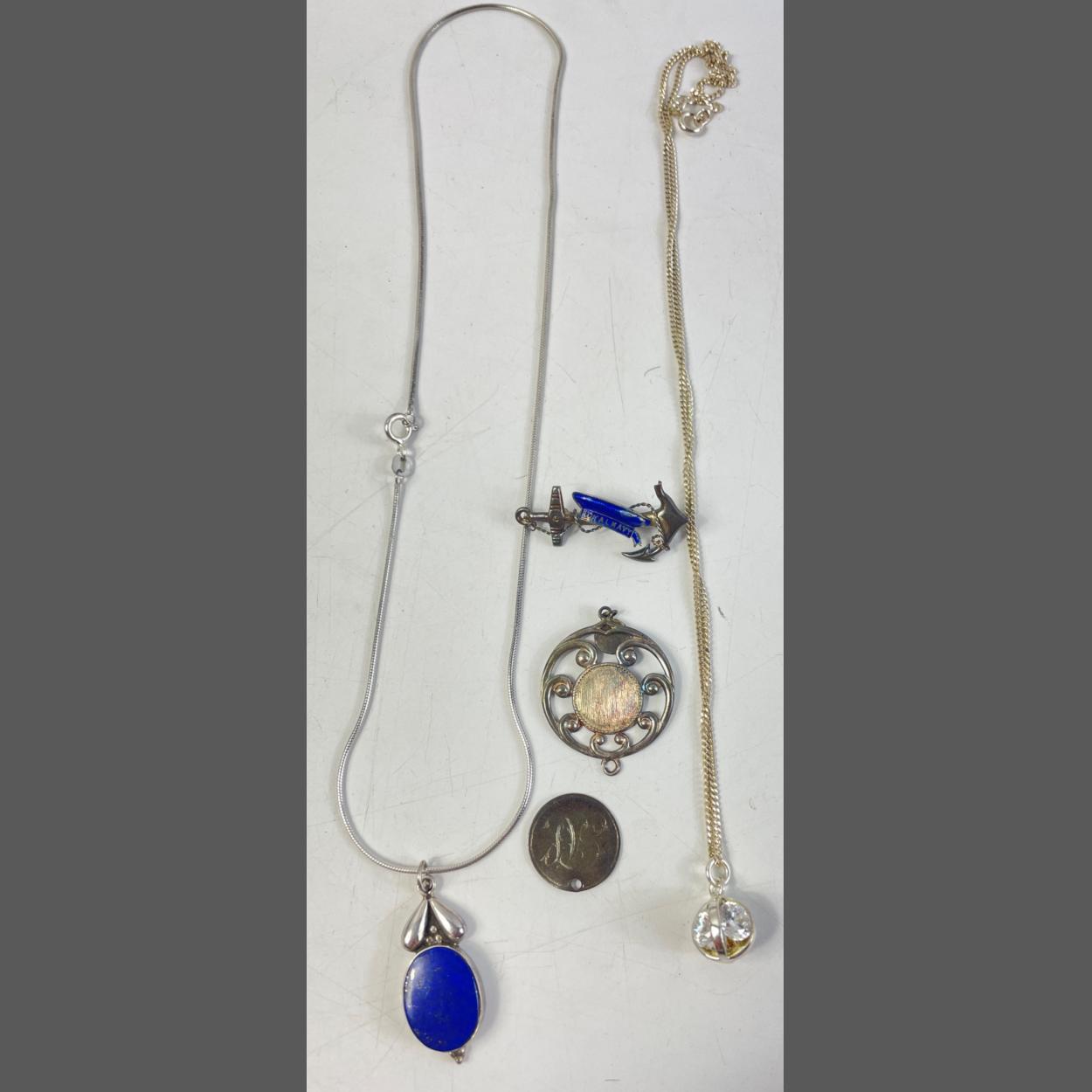 A collection of silver items to include two silver pendants on chains, a round cylindrical pendant stamped sterling silver and also an UNUSUAL VINTAGE small ROYAL NAVY unmarked white metal brooch in anchor form with blue enamel decoration