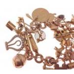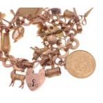 A lovely 9ct stamped CHARM BRACELET FILLED with a multitude of charms(some stamped and others unmarked) to include a small heart-shaped locket 375 stamped with also a 1/4 ounce Krugerrand with a diameter of 22.06mm and a weight approx 8.40g approx - all in fine 22ct yellow gold - with also a Belfast medallion 'Behold I Come Quickly' rev .3.2 1819 - combined weight 55.29g