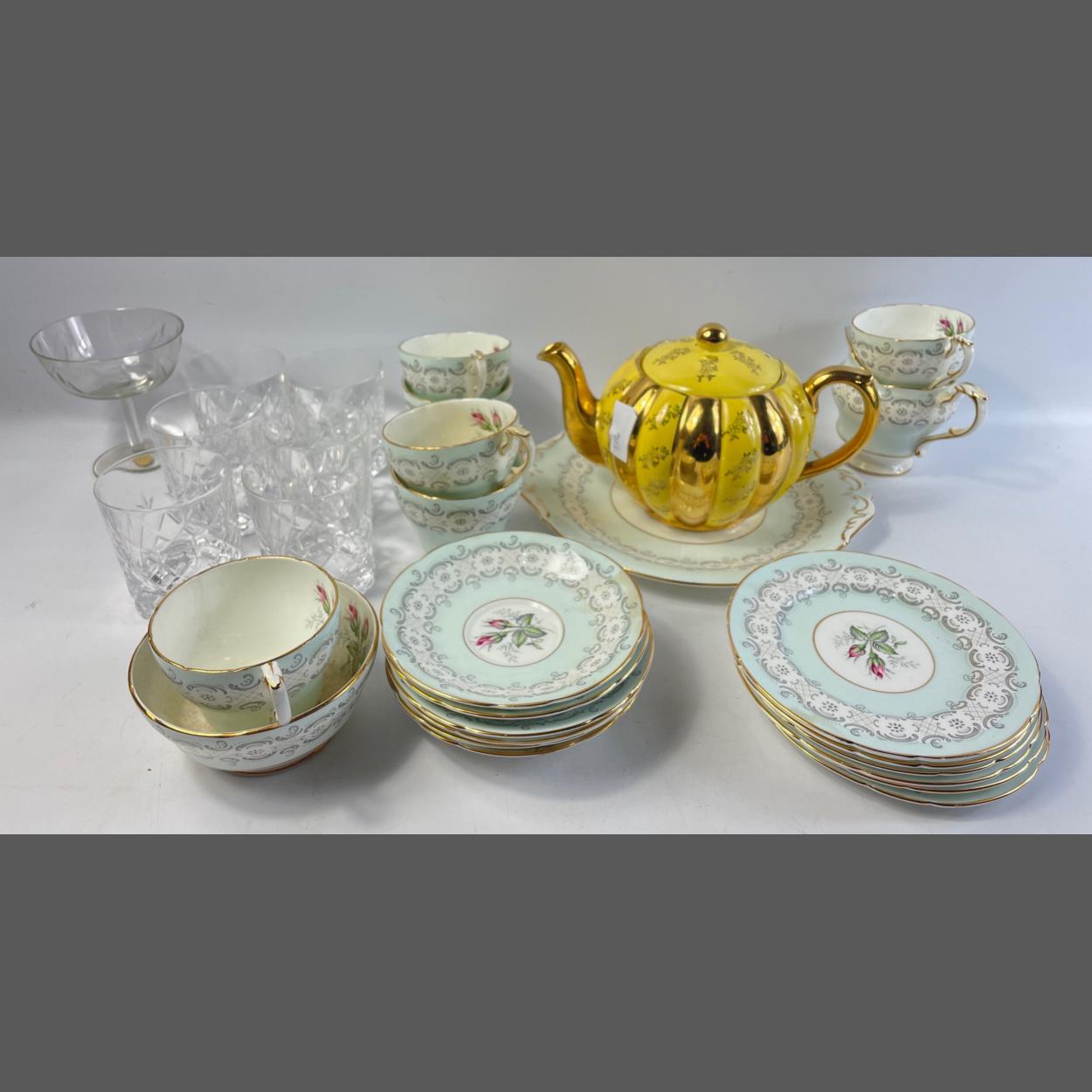 A vintage PARAGON tea service decorated internally with rose buds comprising 6 cups, 6 saucers, 6 side plates, 1 cake plate, 1milk jug and 1 sugar bowl (small crack in bowl) plus a large yellow and gilt teapot, 5 crystal whisky tumblers and 1 smaller