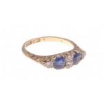A SUBSTANTIAL 18ct stamped yellow gold ring with STUNNING SAPPHIRE and DIAMOND setting - two large sapphires dimension 4mm diameter approx flanked by 4 smaller sparkling diamonds(tested) 2/3mm diameter approx - ring size P/Q gross weight 4.10g approx