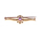 A BEAUTIFUL 9c stamped yellow gold bar brooch with a purple stone centred and pearls surrounding this - dimension 4.5cm weight gross 4.02g approx