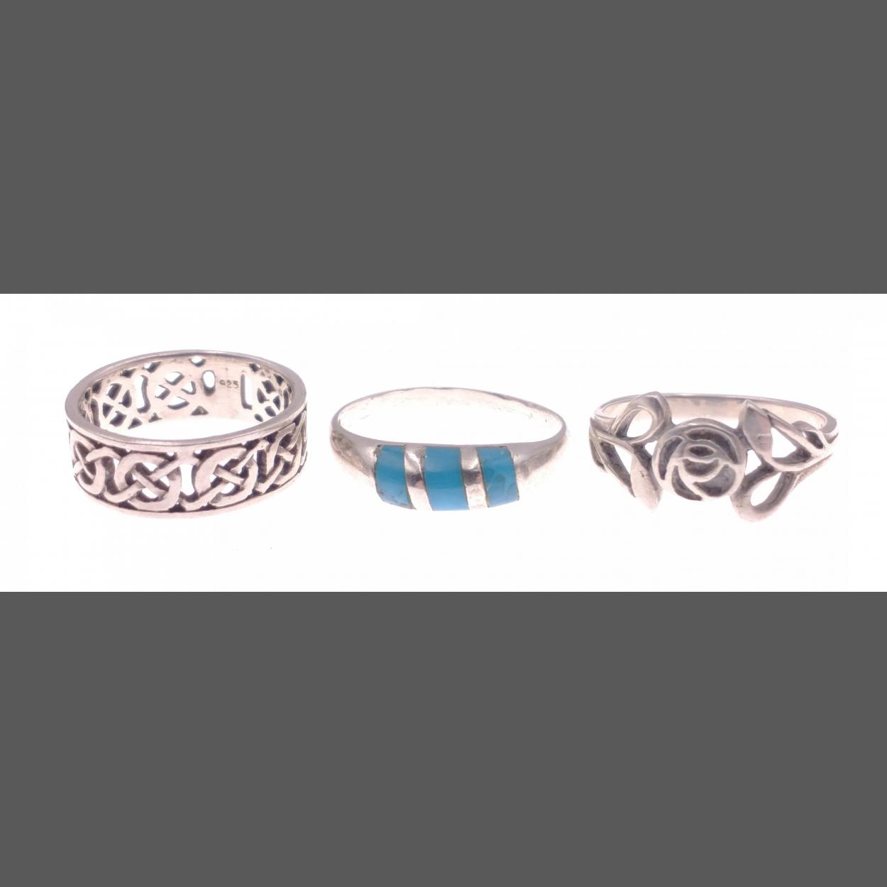 Three silver rings stamped 925 including one with a rose size N, one with a Celtic knot design size K and one set with blue stones size P, gross weight 6.9g