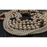 Three strings of faux pearls of varying lengths and a brooch set with faux pearls and clear stones (6cm long)