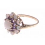 An attractive 9ct gold ring with opal cluster and amethyst coloured stones. Size M and weighs 4.3g gross approx.