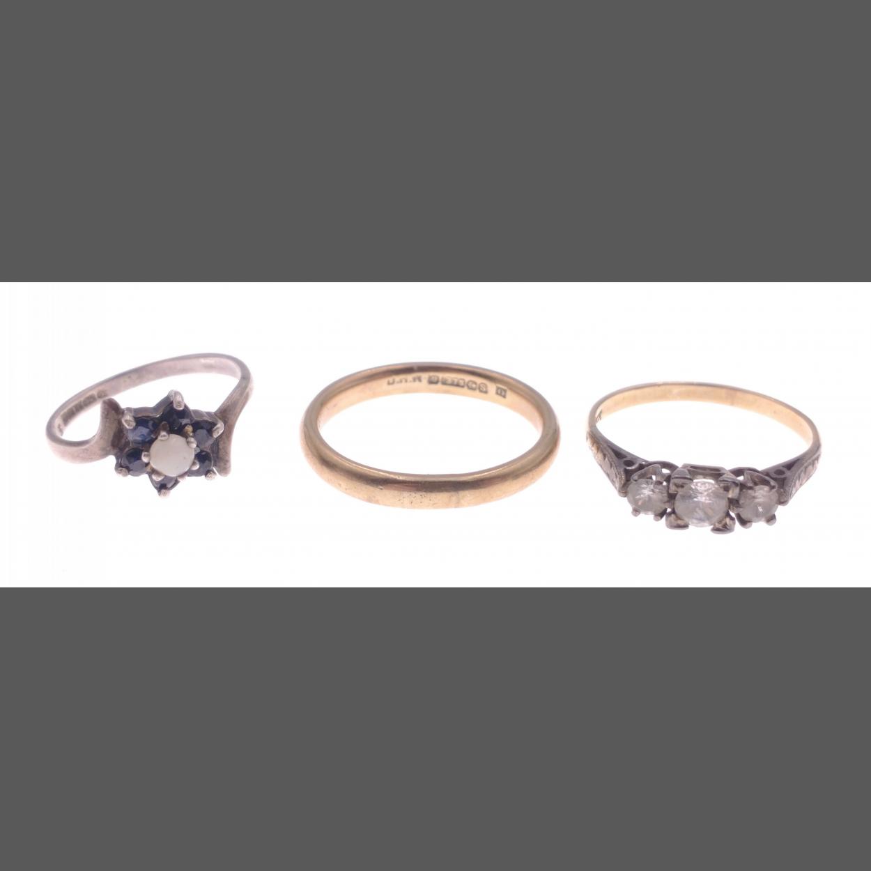 Three Gold rings. Two marked 375 and one 9ct. Comprising a gold band size O weighing 3.1g approx, a cluster ring with red stones and an opal centre size J and weighing 1.4g approx and a three stone ring size N weighing 1.9g approx. Total gross weight 6.4g approx