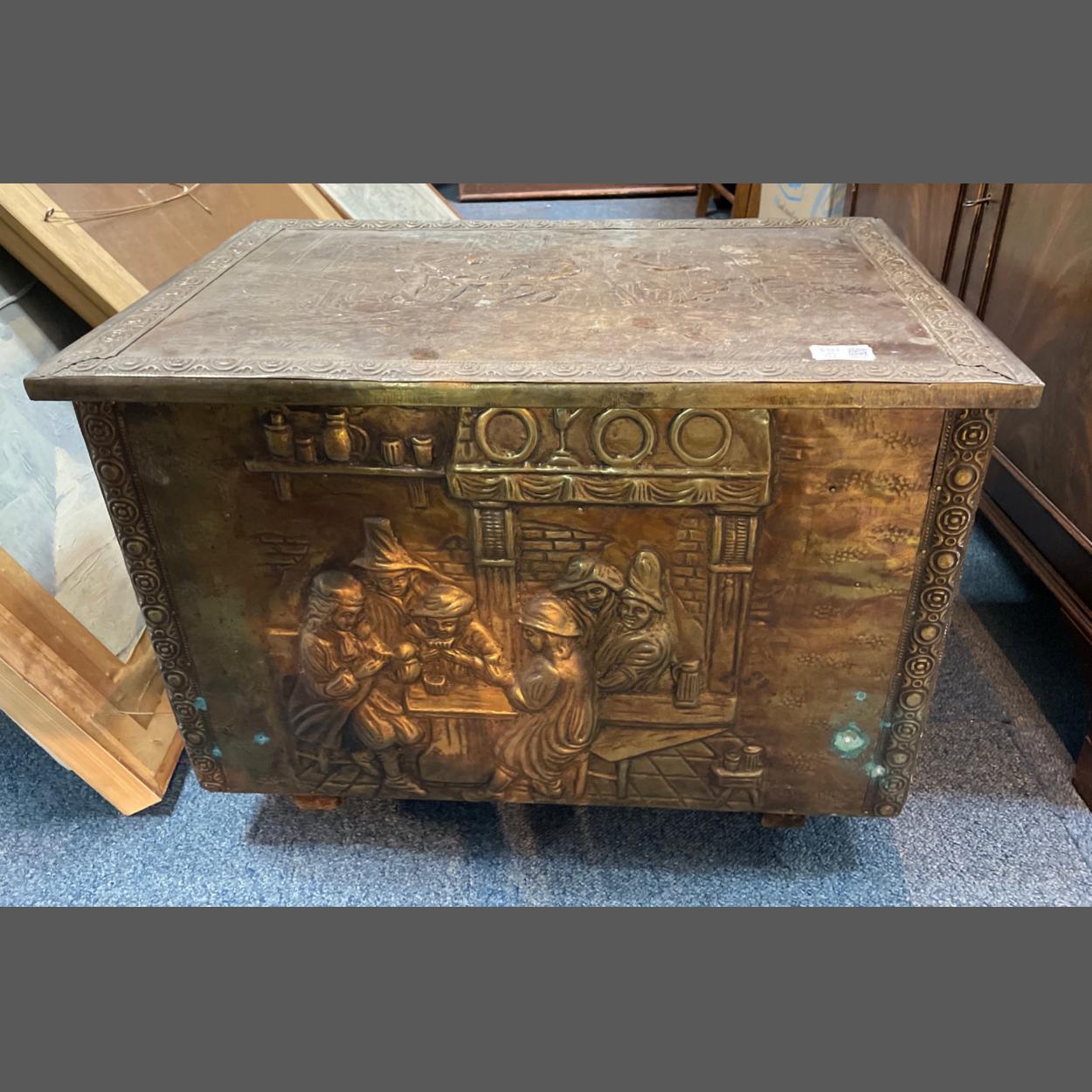 A brass embossed log box 61 x 41 47cm approx. Contains assorted brass and copper items.