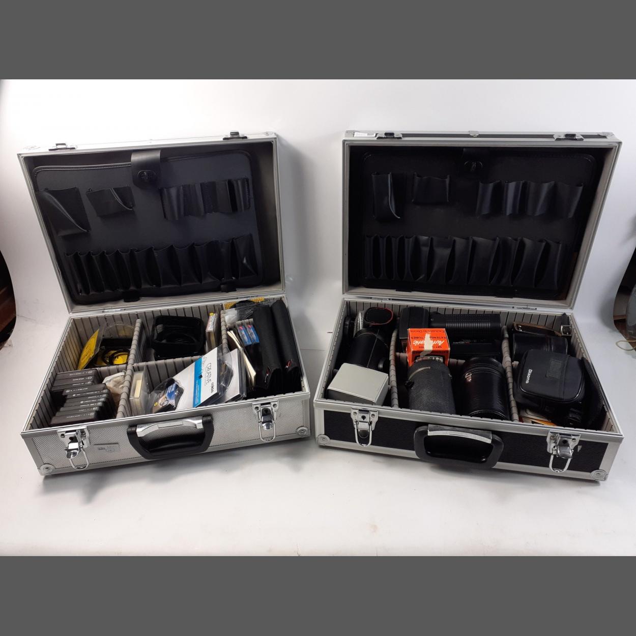 For the camera enthusiast - two hard-sided cases with adjustable fittings plus various lenses to include a PRINZFLEX auto reflex 1:2.8 no 732359, a HELIOS MC ZOOM AUTO 1:5.5 no 813018-10, a HELIOS - 44M, a HELIOS auto converter 3x plus a quantity of flash guns and filters etc