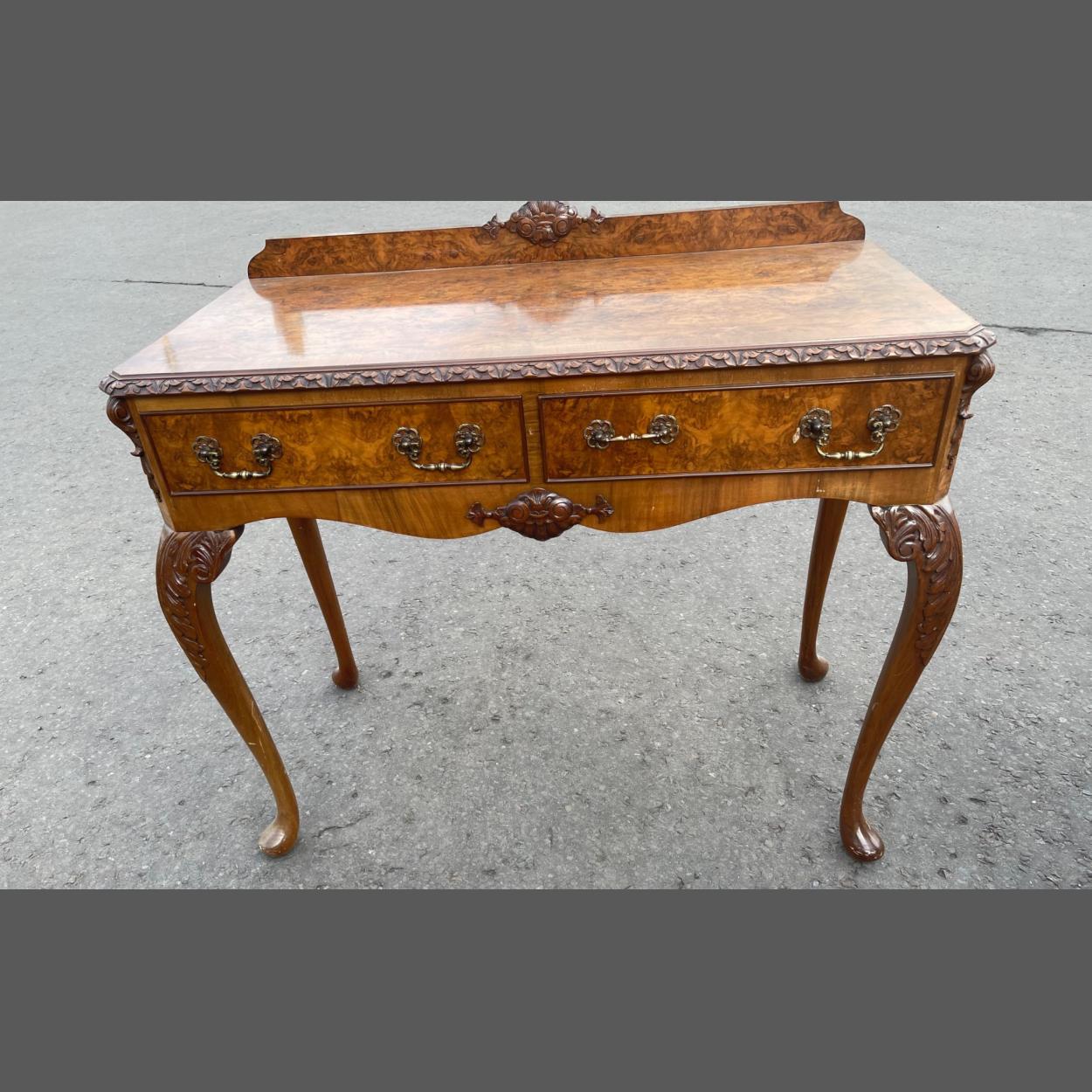 LOVELY QUALITY! Walnut veneer console table with two drawers, brass handles and carved decorated edges