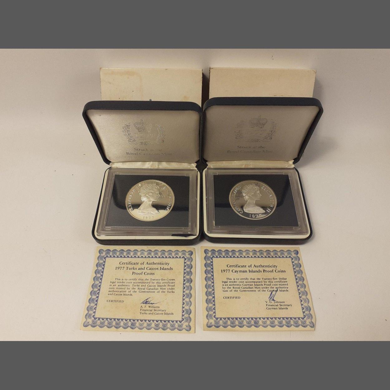 Two proof slabbed and cased 1977 QUEENS SILVER JUBILEE coins to include Cayman Islands $25 and Turks and Caicos 25 crowns. Outer boxes with wear otherwise excellent.