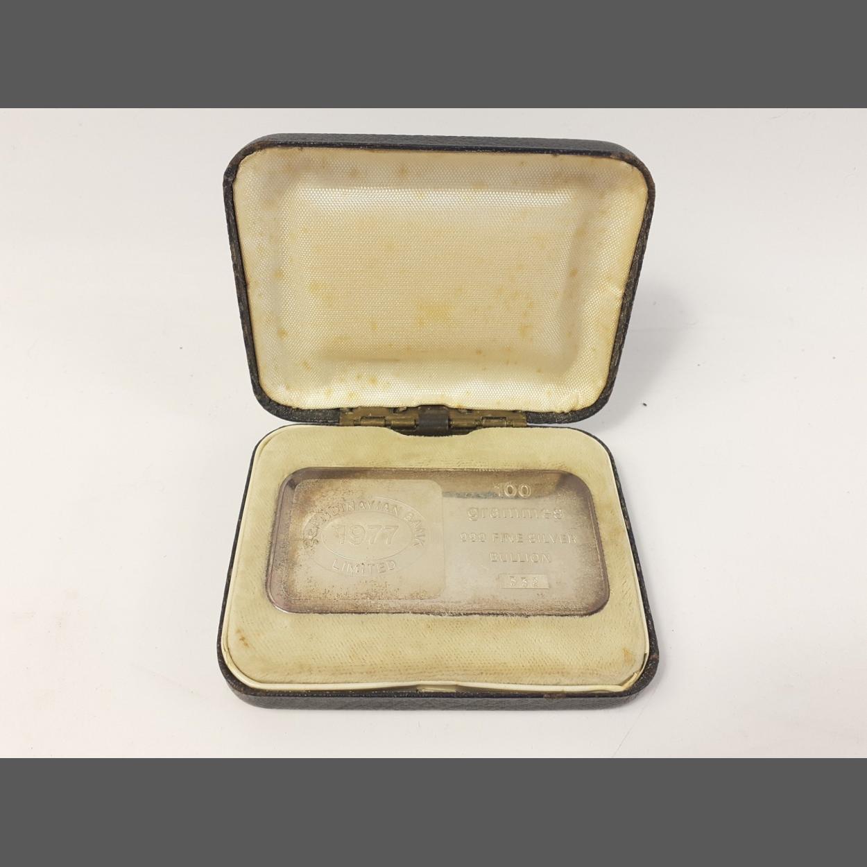 1977 Scandinavian Bank100g .999 silver ingot in presentation case. Heavily toned and box has staining. Ingot numbered 332