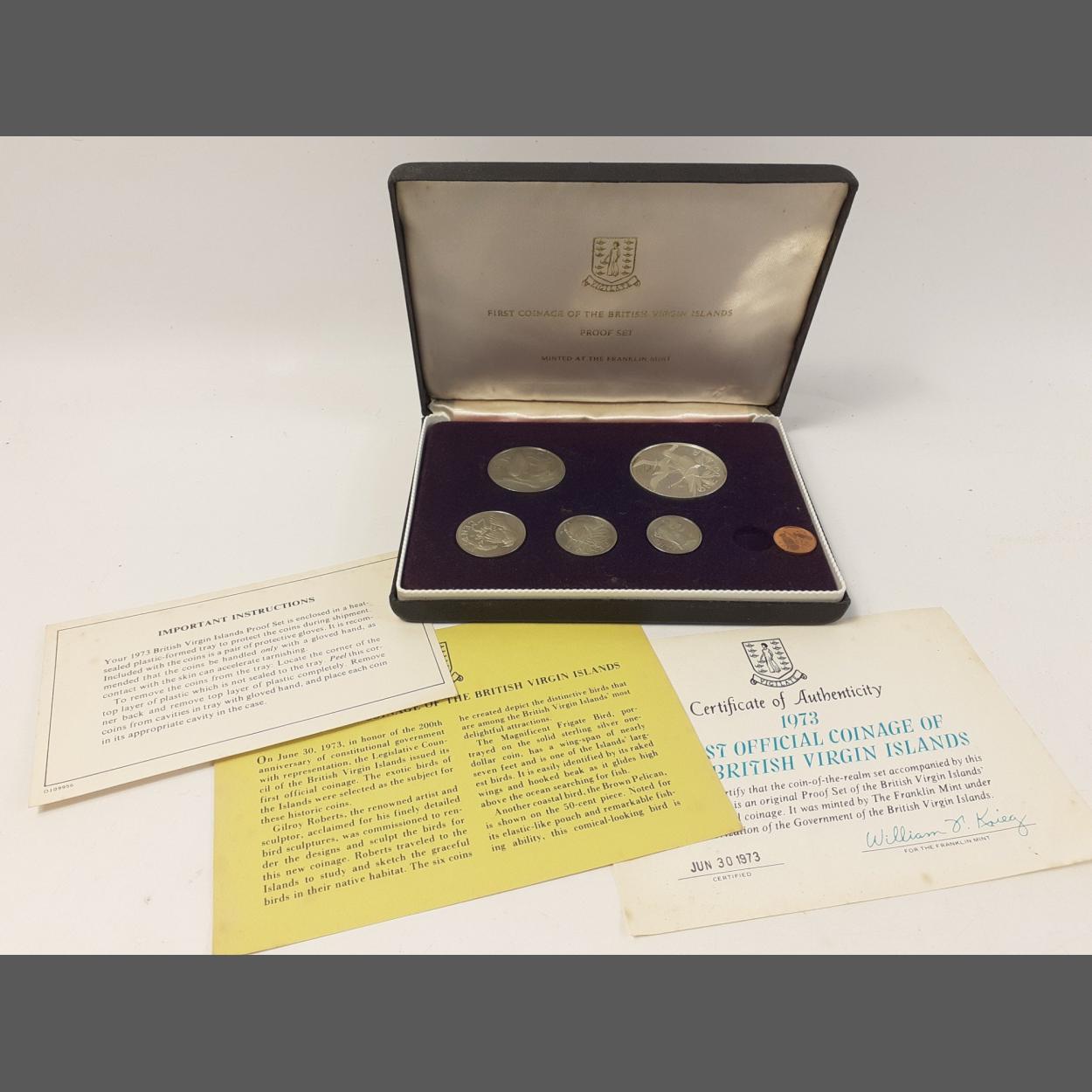 1973 BRITISH VIRGIN ISLANDS proof set in Franklin Mint presentation case with COA. Wear to box from poor storage but coins are in good presentable order.