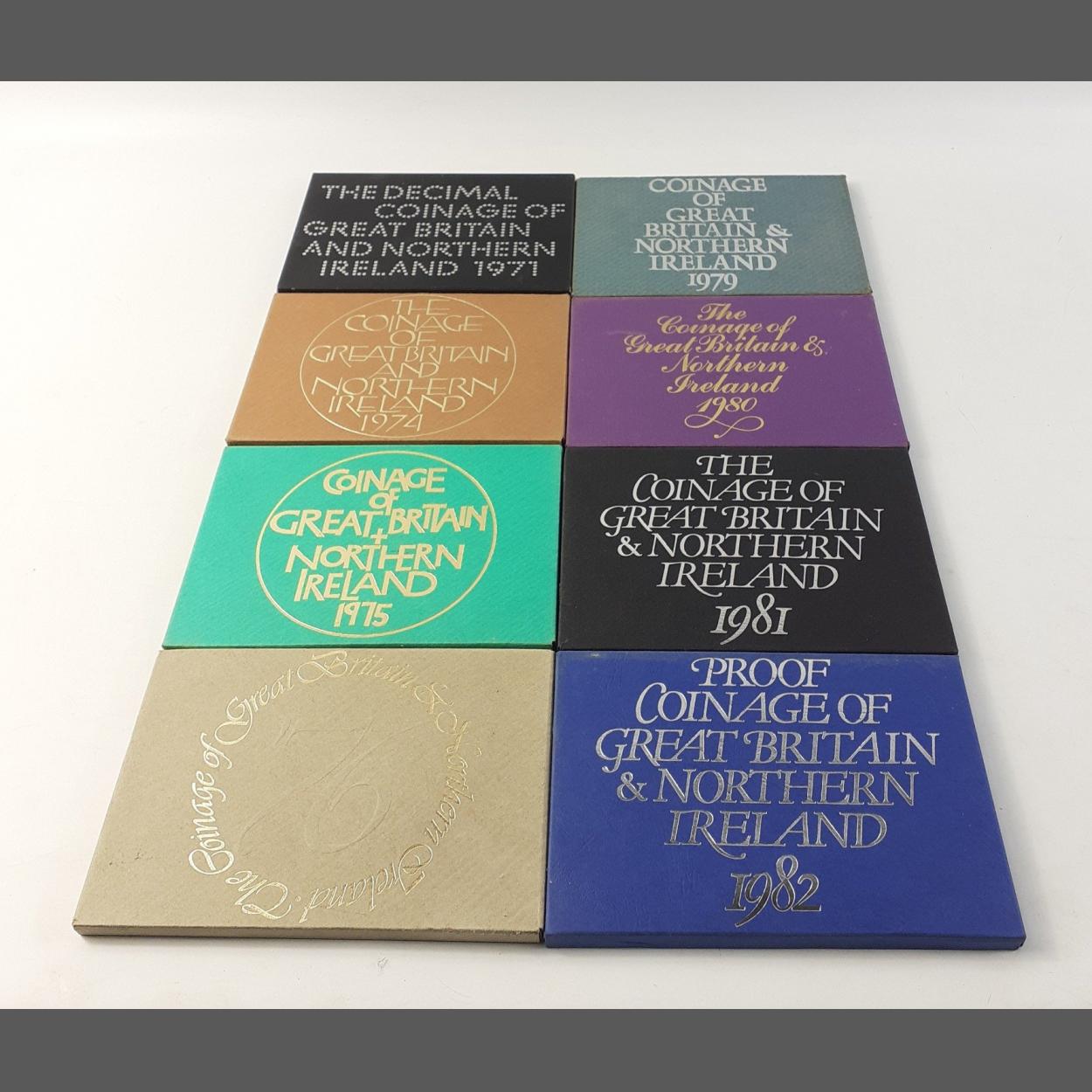 Eight proof COINAGE sets of Great Britain and Northern Ireland from the following years: 1971, 1974, 1975, 1976, 1979, 1980, 1981, 1982, all in original presentation packing