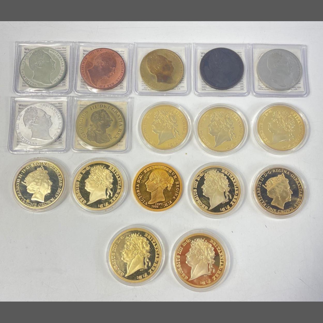 A quantity of reproduction / retro pattern Crowns and others. Specimen pieces some with certificates. An interesting lot of beautiful reproduction.