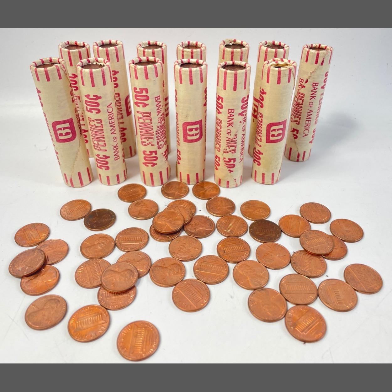 BANK OF AMERICA Penny Rolls x 13. Fifty cent unopened rolls appear to be all from 1981. A super collection of Lincoln Cents. Includes a further quantity of loose cents.