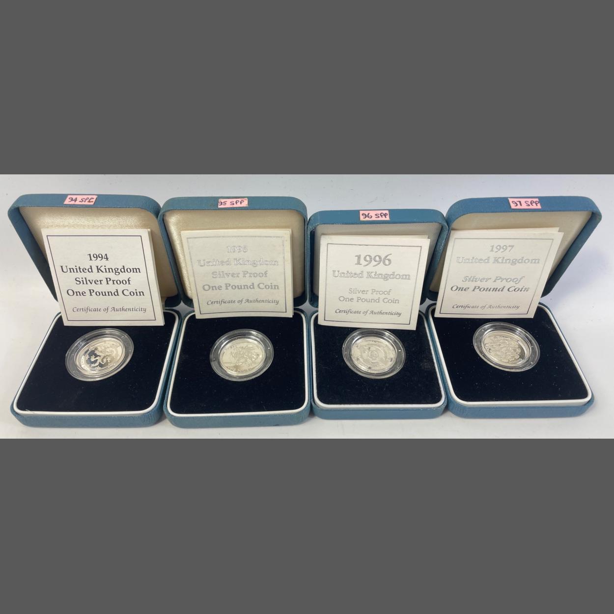 Four boxed ROYAL MINT United Kingdom silver proof one pound coins from 1994, 95, 96, 97