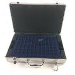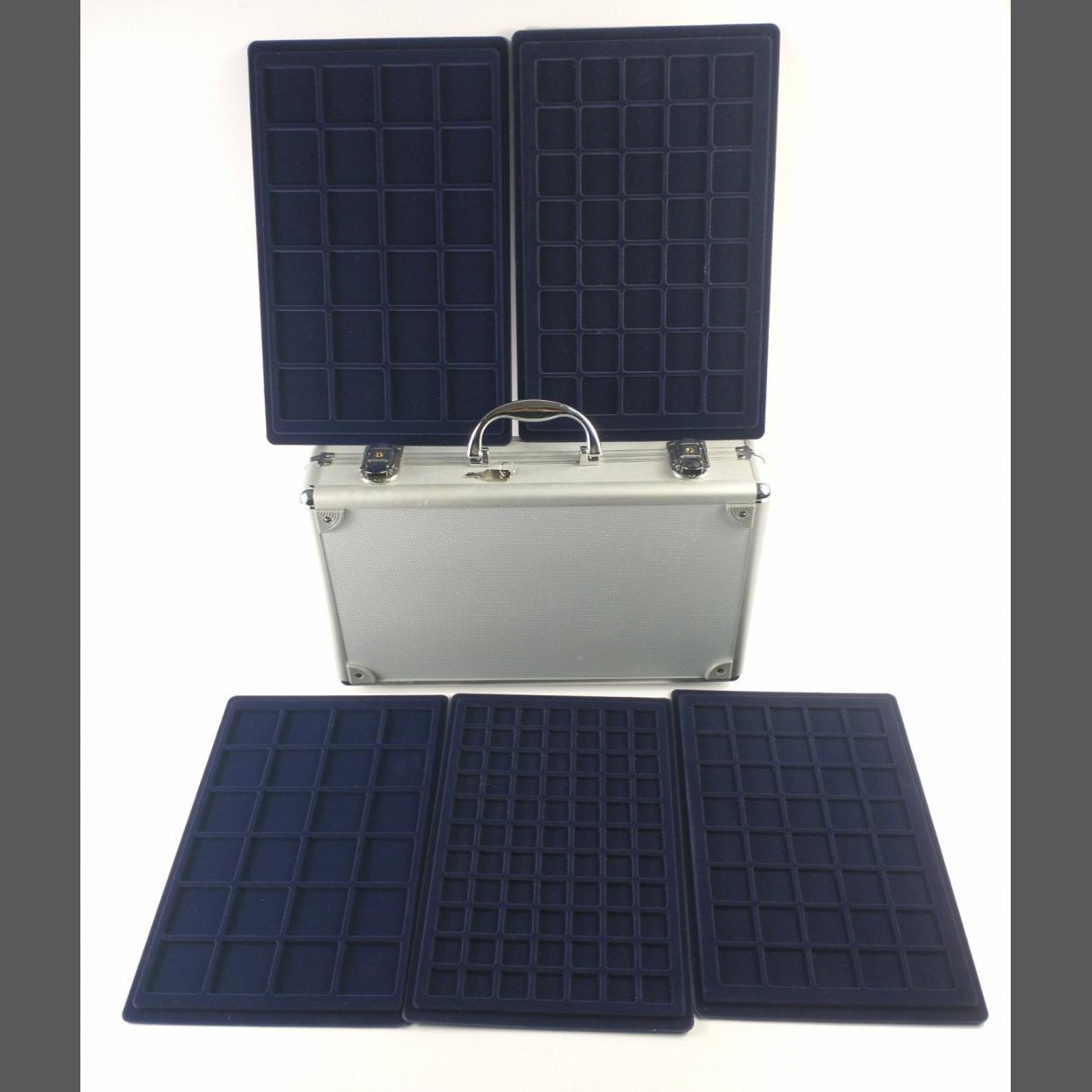 An aluminium coin carrying case with 5 removable various sized trays, 40x20x10cm. Comes complete with key