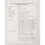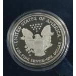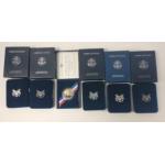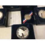 Five AMERICAN ONE OUNCE SILVER PROOF EAGLES in boxes with plush cases and paperwork 1994, 1995, 1996, 2000, 2002 Lot includes American Mint World War II 50TH Anniversary Proof Clad Half Dollar in box with COA.