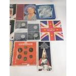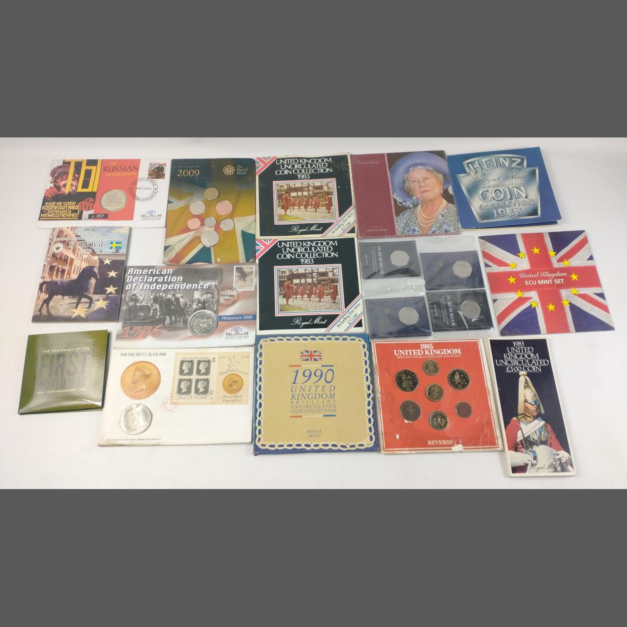 A collection of coins and coin sets on cards to include 1971 Russian Revolution 1 Crown Cover, Isle of Man Penny Black coin and cover, American Independence Coin and Cover, 1985 UK 1985 coin set, 1990 UK coin set1983 Coin set x2, ECU 1992 Mint set, Heinz 1983 set, Queen Mother Centenary pack, 2003 Euro Sweden pack, 1983 UK £1WWI Centenary £5 pack, 2009 change pack and two double 50p packs from 2021. All coins excellent some packs have wear