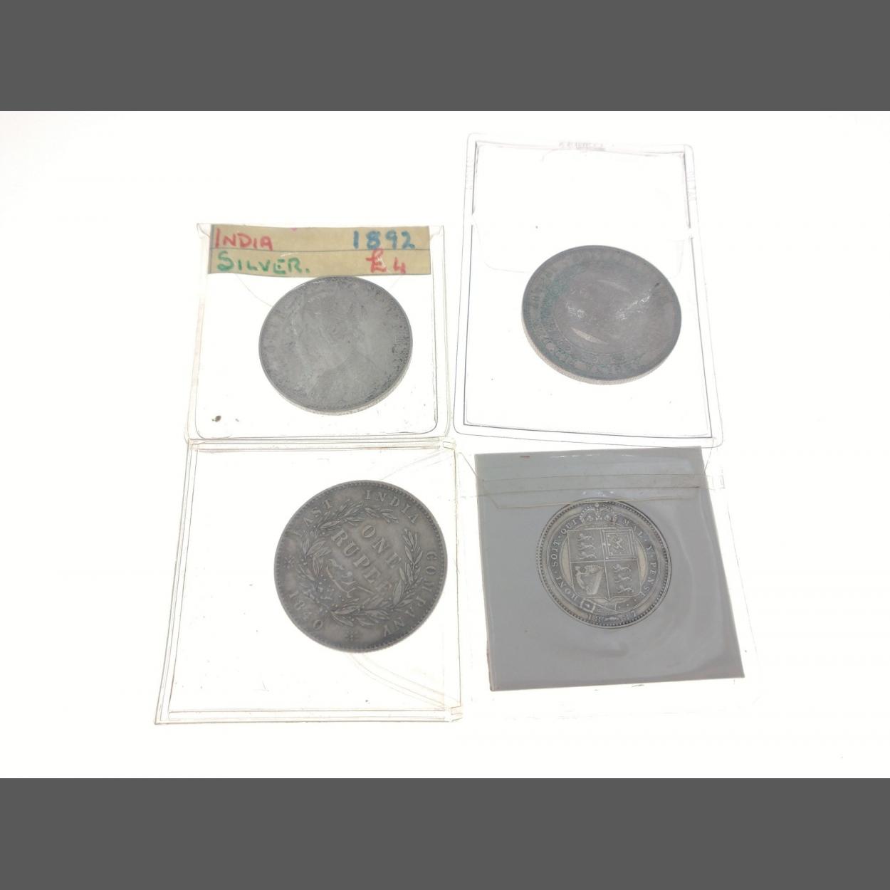 Four nice grade VICTORIAN Silver coins. 1887 Halfcrown, 1840 East India One Rupee, 1892 India One Rupee, 1887 Shilling.