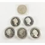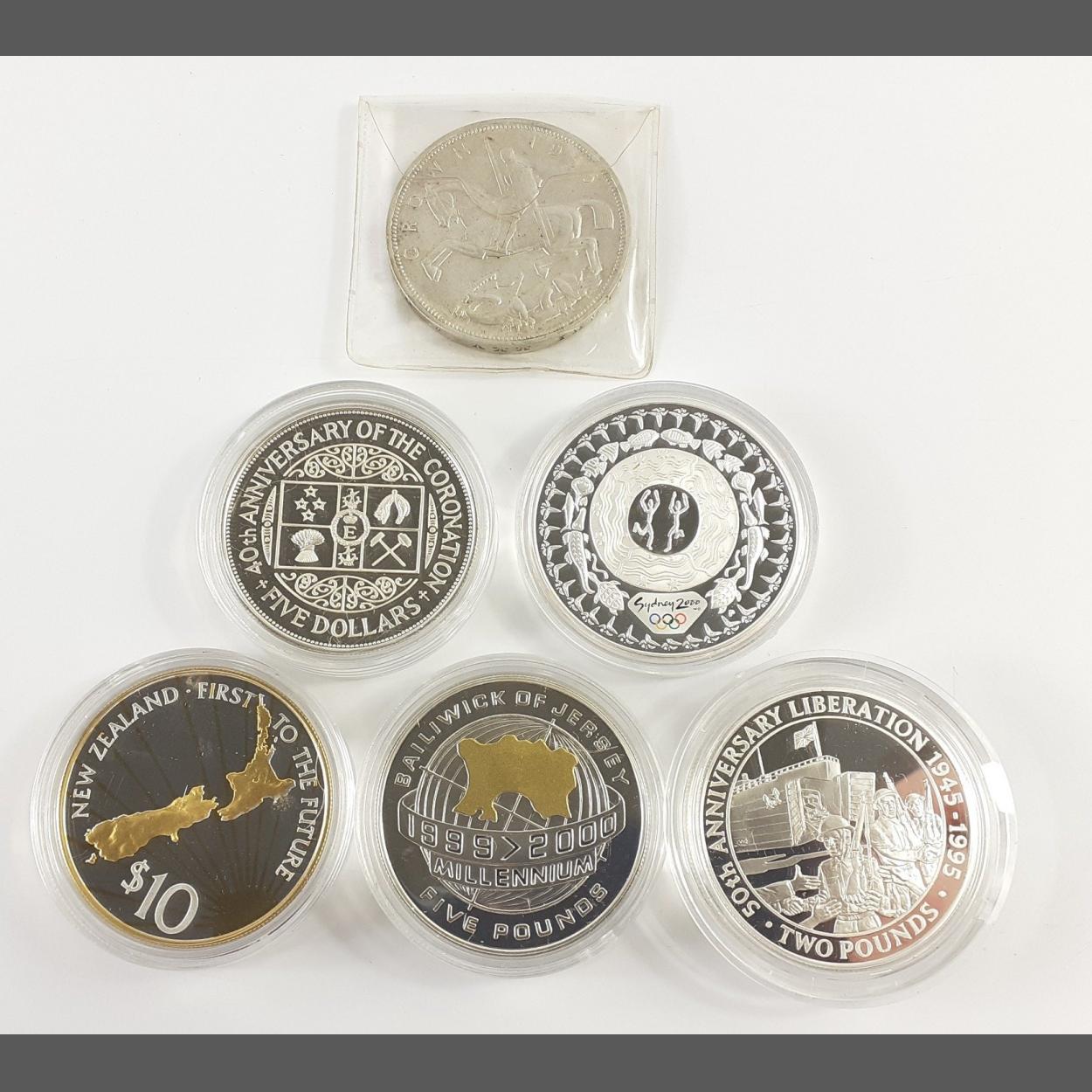 Small collection of proof 'crowns' and a 1935 Rocking Horse Crown to include 2000 Jersey Millennium, 2000 Australia Sydney Olympics, Guernsey 1995 Liberation £2, 1993 New Zealand Five Dollars and a New Zealand 2000 gilt edged $10. Six in total.