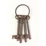 SIMPLY MARVELLOUS! A SET of FOUR decorative large rusty old keys all on a solid ring - each key 14cm length