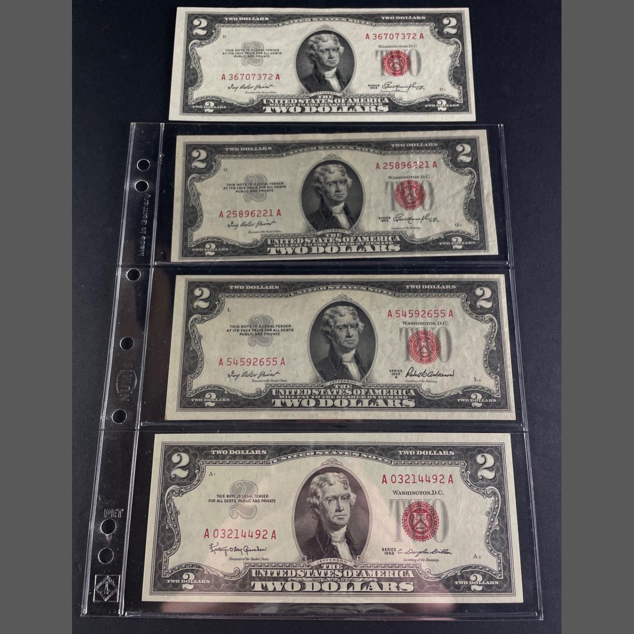 UNITED STATES 1953 Two Dollar Banknotes x 4. All Red Seals. All 'A' Prefix Notes. All nice notes in good collectible grades.