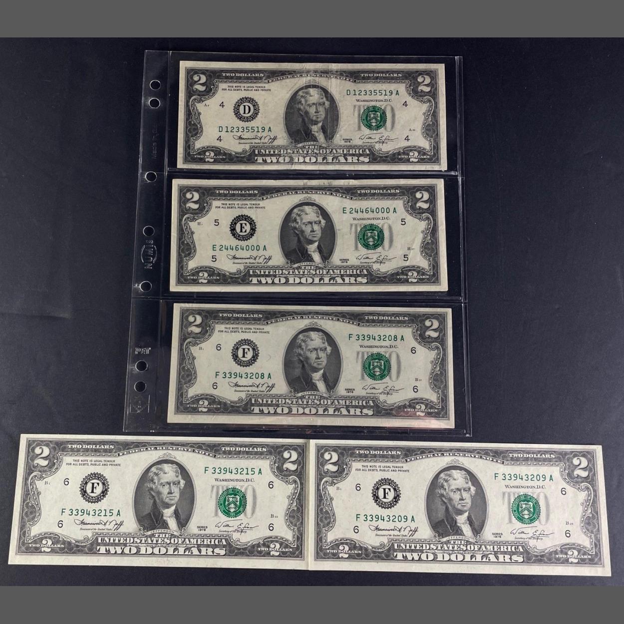 UNITED STATES 1976 Two Dollar Banknotes x5 . All Green Seals. Include a sequential pair of F notes . All nice notes in good collectible grades, D note does have some creasing.