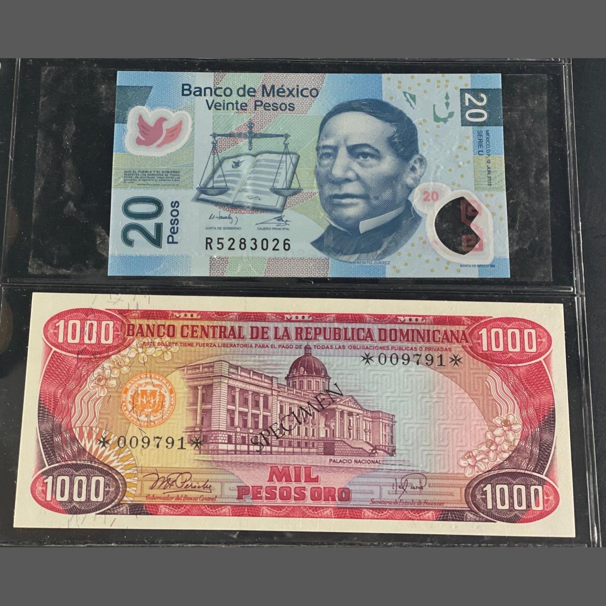 Dominican Republic Banknote. 1000 Peso / Pesosoro Star Note Specimen in excellent grade. Also a 2012 mint unc Mexico 20 Pesos