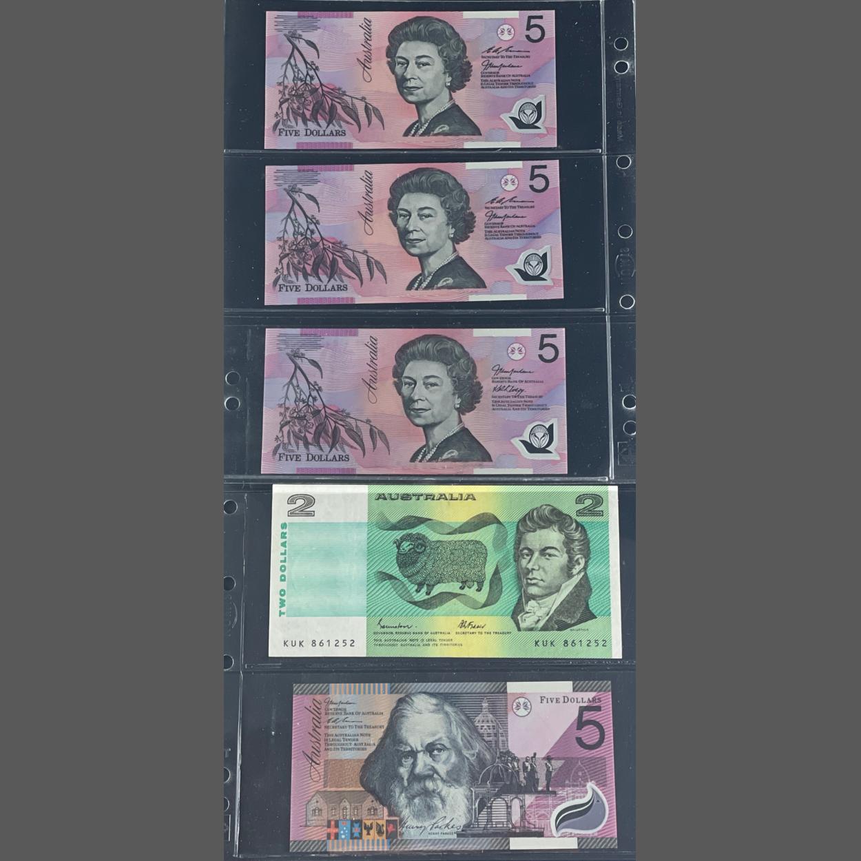 AUSTRALIA Banknotes of interest to include three QEII x UNC $5, one Parkes UNC $5 and one UNC Two Dollar. All excellent.