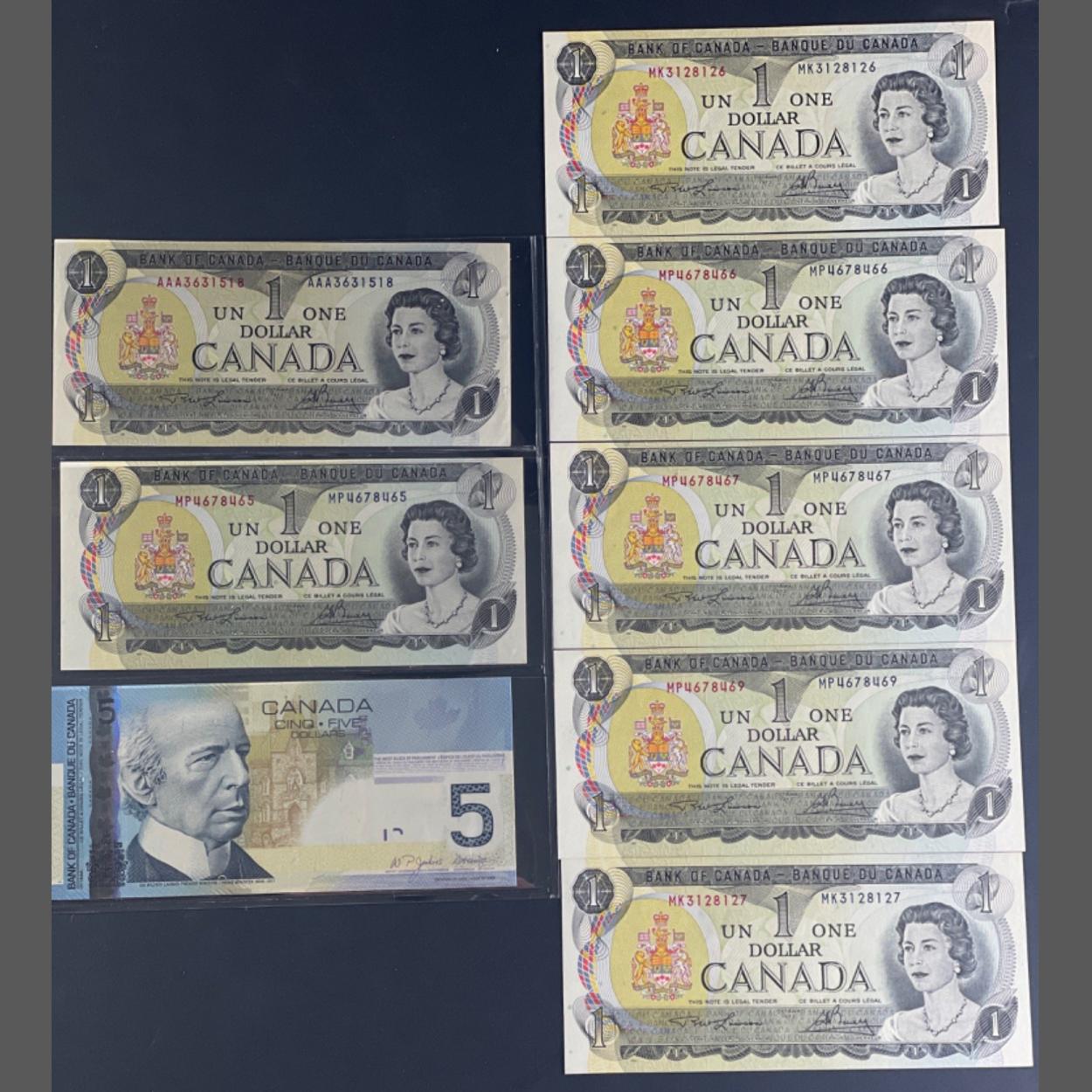 CANADA Banknotes. A superb collection of interesting notes to include a 1973 $1 AAA Prefix UNC, six other 1973 $1 including a sequential run of three and a run of two. Also includes a 2006 Wilfred Lauder $5. All eight notes in super grades