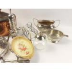 A mixed lot to include EPNS 13 teaspoons, 6 dessert forks, sugar snips, a sugar shaker, a copper kettle 25cm height, a pewter quaich, etc