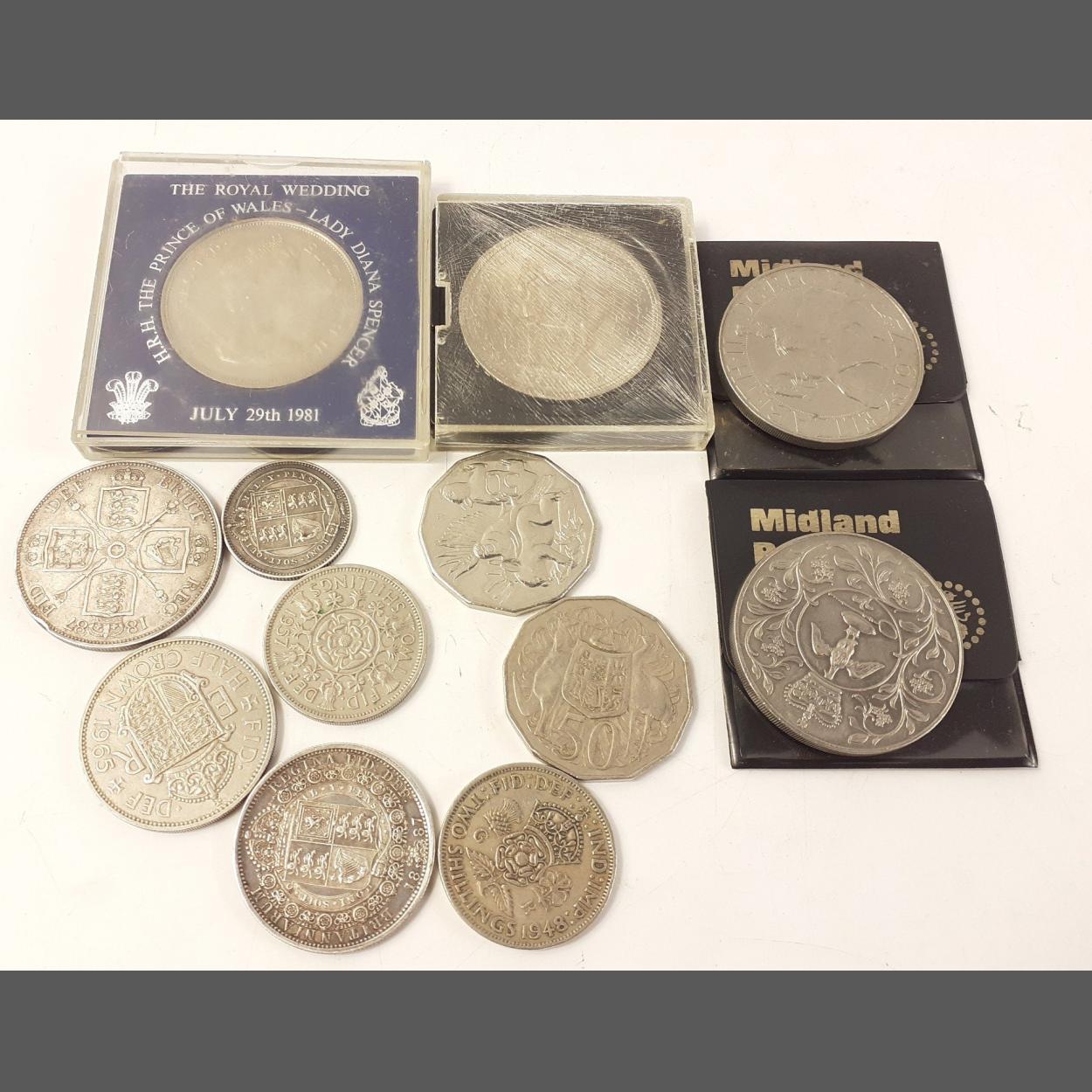A small quantity of coinage to include 1977 commemorative coins, 1981 Charles and Diana wedding coin, 2 Australian 50 cents coins and others etc