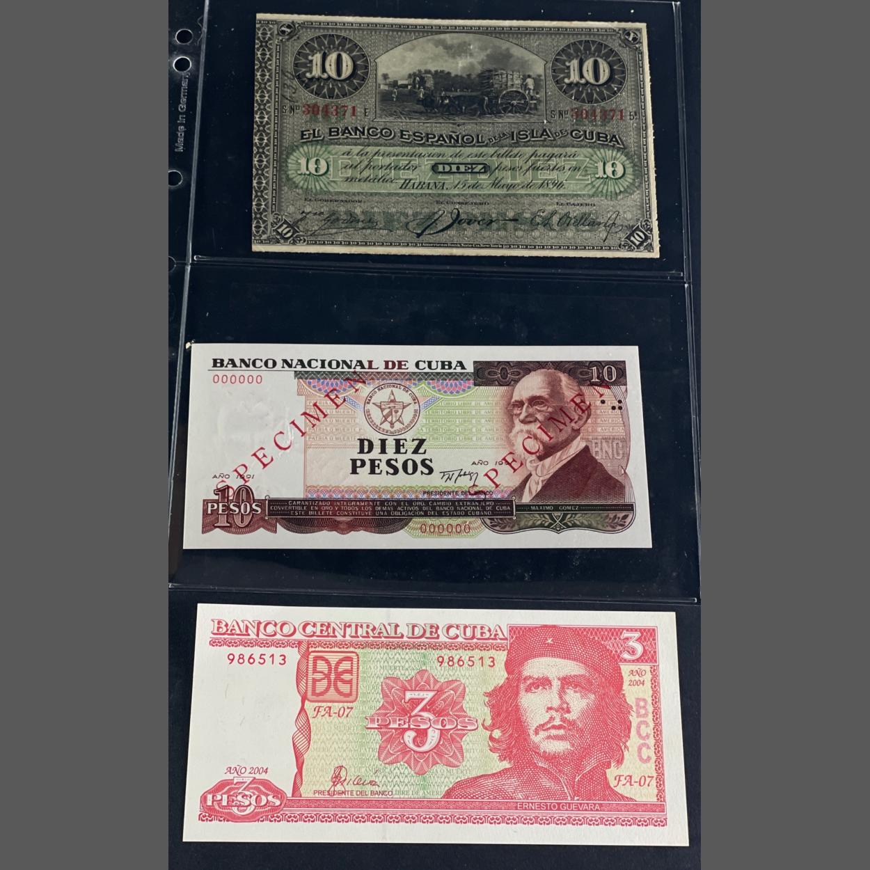 CUBA Banknotes of interest x 3 to include 1896 10 Diez Pesos Sugar harvest note, a 2004 crisp 3 Pesos and a crisp 10 Pesos Specimen from 1991