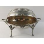 An oval white metal chafing dish with lid decorated with repoussé zodiac symbols standing on 4 legs, approx 23cm high, 36cm in length
