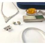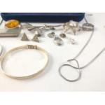 Small box containing 2 pairs of gold earrings, silver and white metal goods to include brooches, 2 necklaces, a christening bangle, and a 9ct rolled gold christening bangle, etc gross weight 95g. One earring hallmarked 375 set with opals approx 0.7g gross and other stamped 750 set with different coloured stones (purple and smoky grey) gross weight approx 1.5g