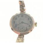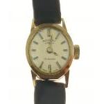 A 375 stamped yellow gold ROLCO circular faced watch with yellow metal stretch strap, gross weight 17.45g and also a 375 stamped ROTARY oval shaped yellow gold ladies watch with black leather strap gross weight 8.35g