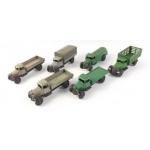 DINKY Lorry Collection. 1940s Vintage Liverpool grey (three shades) Tipper No 25e Smooth Hubs x 3 One with fixed bed. Includes one canopy. One 25d Petrol tanker. One flat bed with no sides and one gated box lorry. Six in total and all in very presentable condition all with wheels.