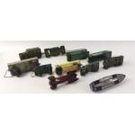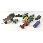 A small but interesting collection of DINKY diecast models to include buses, six wheel truck with towed gun, 23d Auto Union in Red, Streamline Racing car and others.