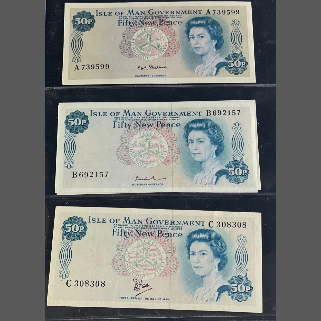 ISLE OF MAN Fifty new pence Banknote selection. Four banknotes to include two 'A' Prefix Notes are good with light wear
